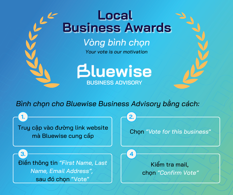 Customers can vote for Bluewise Business Advisory to be Finalist at Local Business Award 2023 to help Bluewise have more motivation to work and devote. Your vote is a recognition of Bluewise’s results and contributions during the establishment journey up to now, we would like to thank the trust and companionship of our customers and partners.