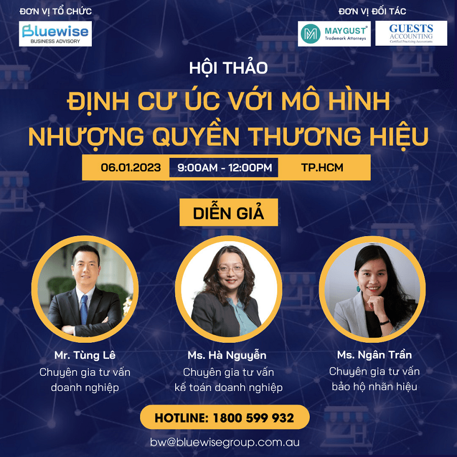 With the strength of more than 10 years of practical experience in the Australian market, Bluewise Group will help you achieve success when doing business and investing in the Australian market. luewise Group has cooperated with reputable partners and experts to organize the event “Immigrate to Australia with Franchise Model” with the aim of supporting businesses and entrepreneurs to understand the Franchise model as well as How to effectively set up and operate a business in Australia to meet the conditions for the 888A/132A visa.